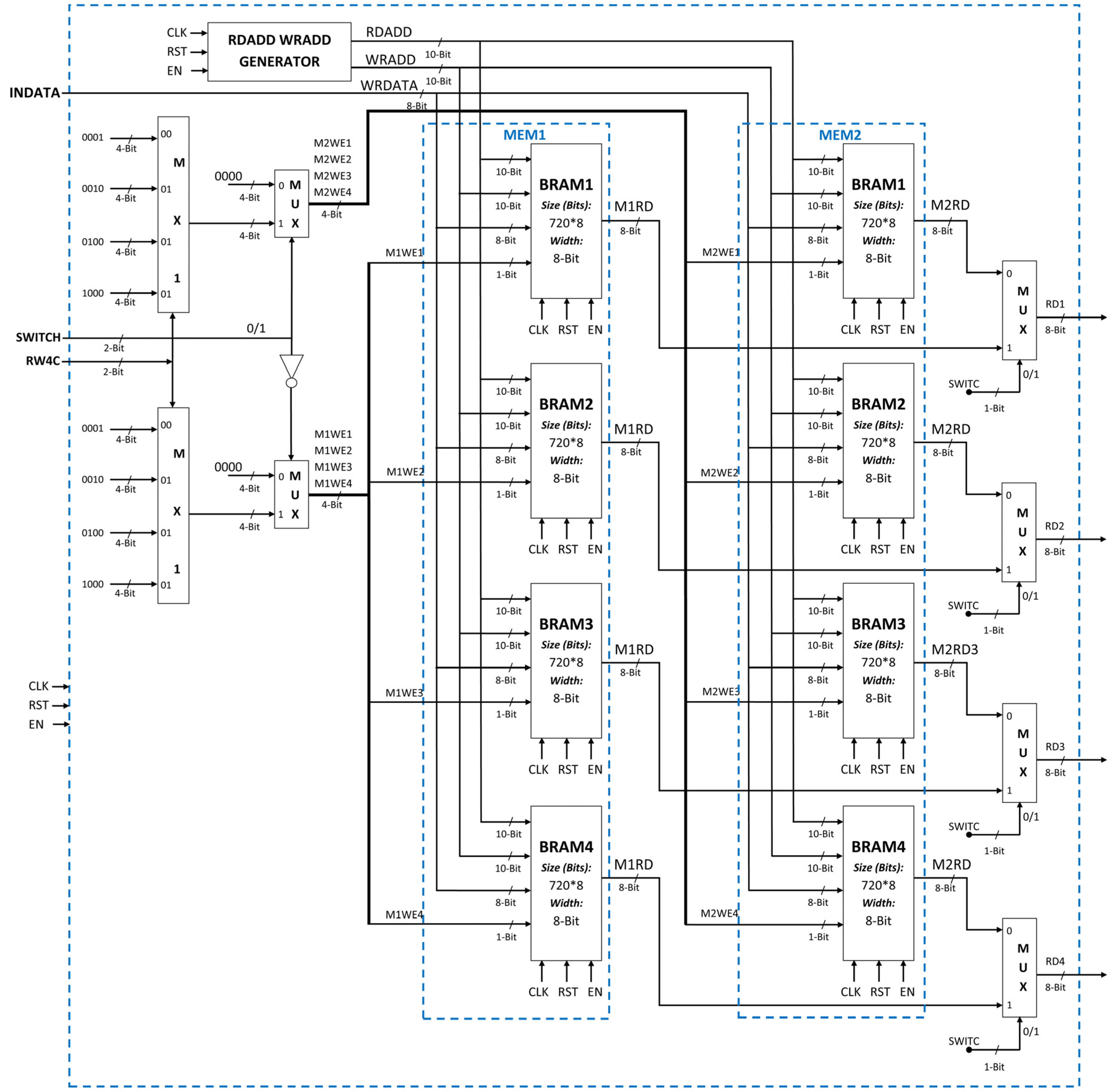 The input buffer memory module (Figure 5) is used to buffer the four rows of input image data. There are two memories (MEM1 and MEM2) in parallel. If the data is written in first memory then the reading is performed from the second memory and vice-versa. Each of the memory is constructed by four block RAMs (BRAMs) in FPGA. These four block RAMs are connected in parallel. Each block RAM is used to buffer one row of image pixel data. The width of each block RAM is 8-bit. The 8-bit input data is applied to the inputs of all block RAMs of MEM1 and MEM2. The read address and write address for the block RAMs of MEM1 and MEM2 are generated by RDADD WRADD GENERATOR. The write enable signals are generated separately based on the row counter (RW4C) and switch value. The selection of four output pixels (read from MEM1 or MEM2) is done by using multiplexers based on switch value.