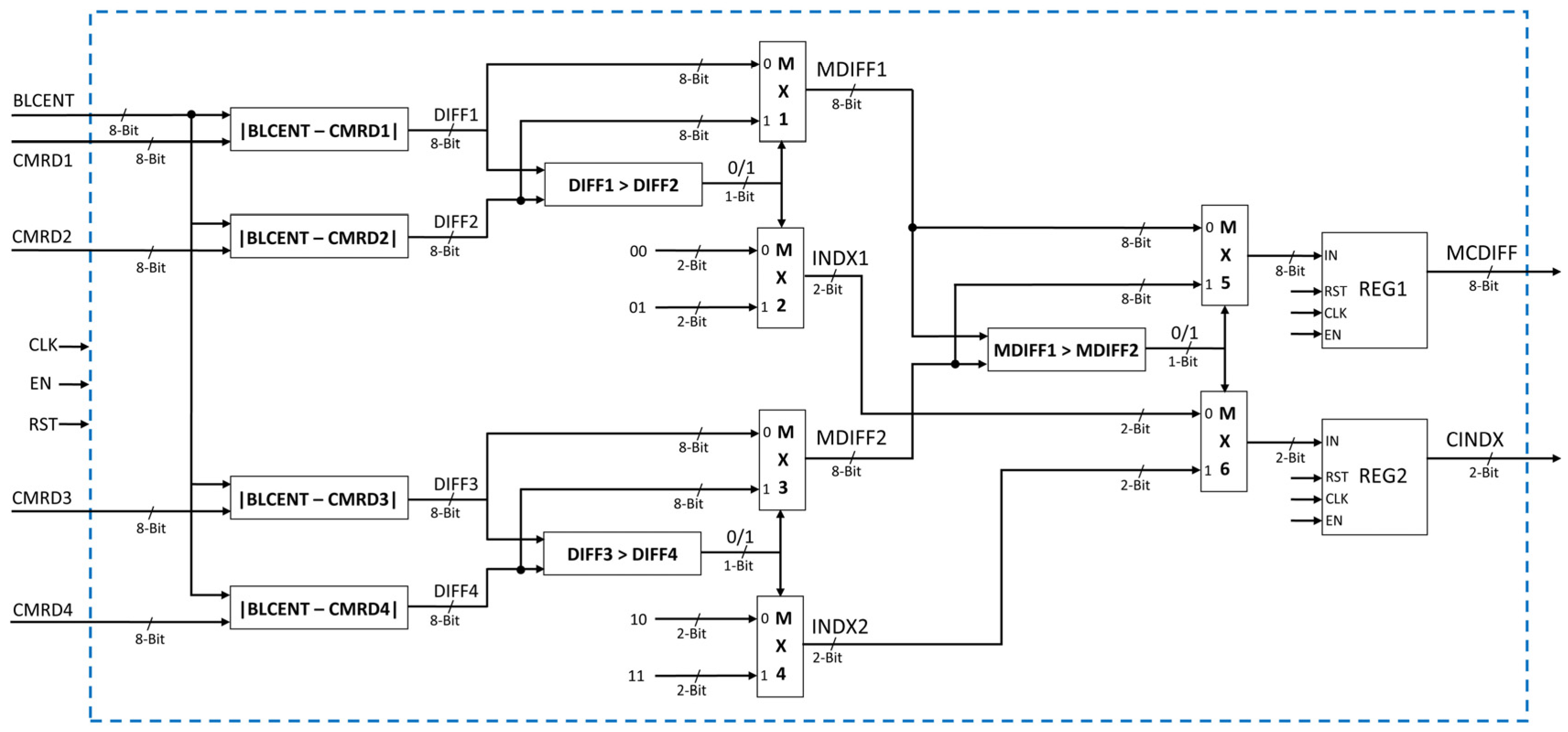The objective of this block (Figure 6) is to find the minimum centroid difference and corresponding index value. The current block centroid value is subtracted from centroid values of four clusters (read from CENT MEM). The four centroid values from CENT MEM are CMRD1, CMRD2, CMRD3, and CMRD4. The absolute difference of current block centroid BLCENT is computed in parallel with these four values. The first two differences are compared and the minimum difference among two (MDIFF1) is computed using comparator and multiplexer. The corresponding index value is also computed (INDX1). Similarly, the last two differences are compared and the minimum difference among the last two differences (MDIFF2) and corresponding index (INDX2) is computed. Finally, using a set of comparator and two multiplexers the minimum centroid difference (MCDIFF) and the corresponding centroid index (CINDX) is computed using MDIFF1 & MDIFF2 and INDX1 & INDX2, respectively.