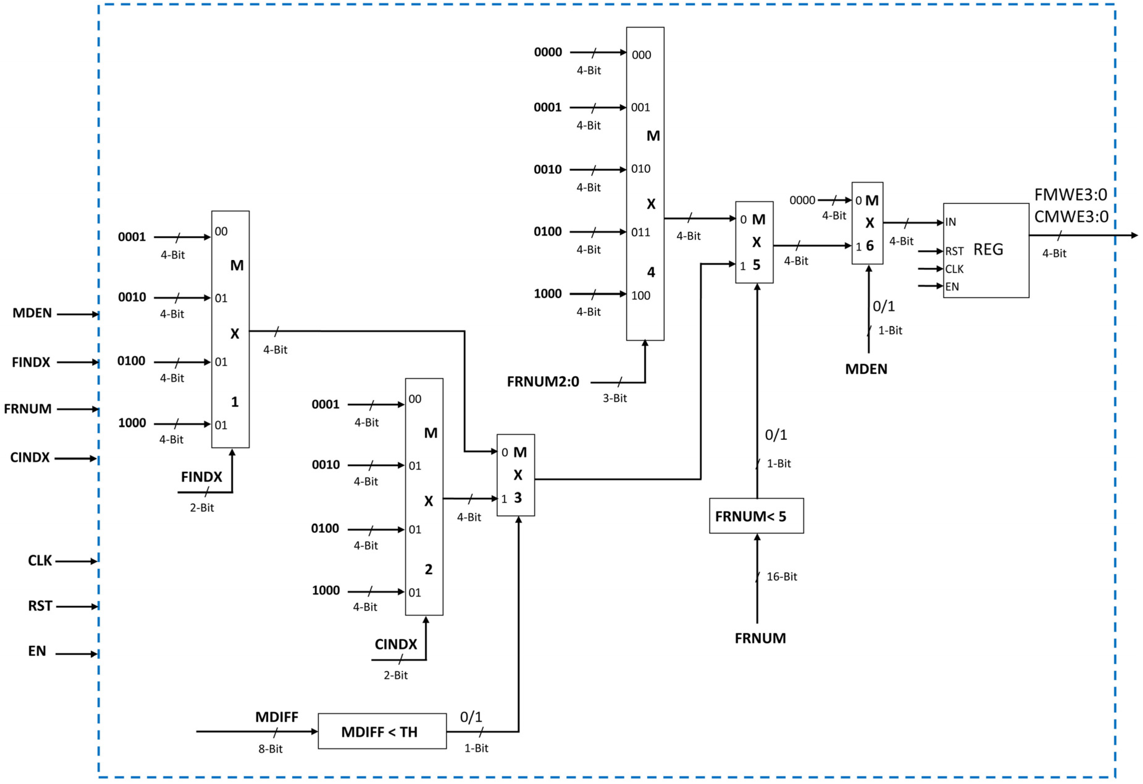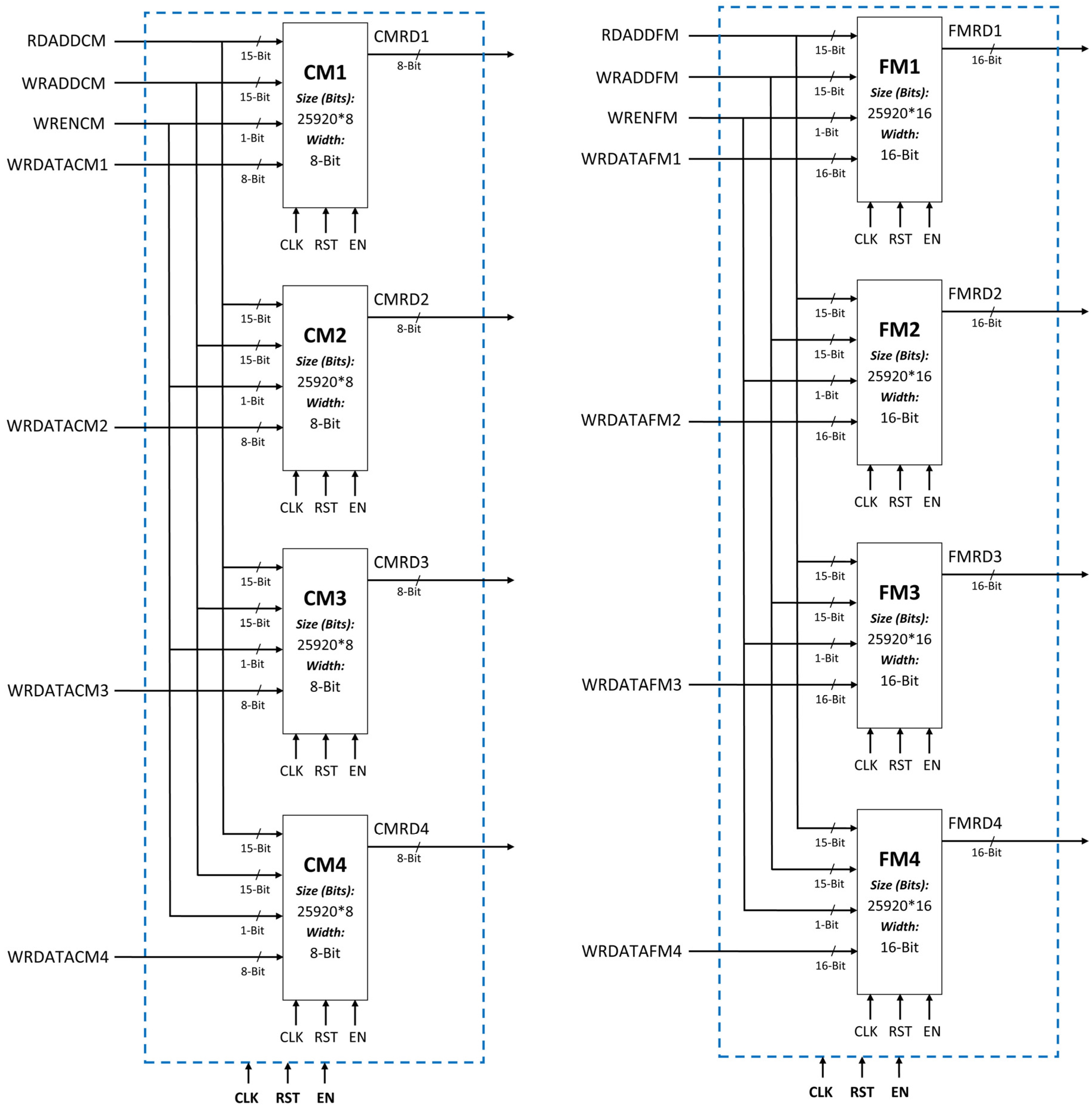 The write enable signals for CENT MEM and FRNM MEM are same. Therefore, a common 4-bit write enable signals is generated for both memories. Each bit of the write enable signal is corresponding to each memory module of the two parameter memories.