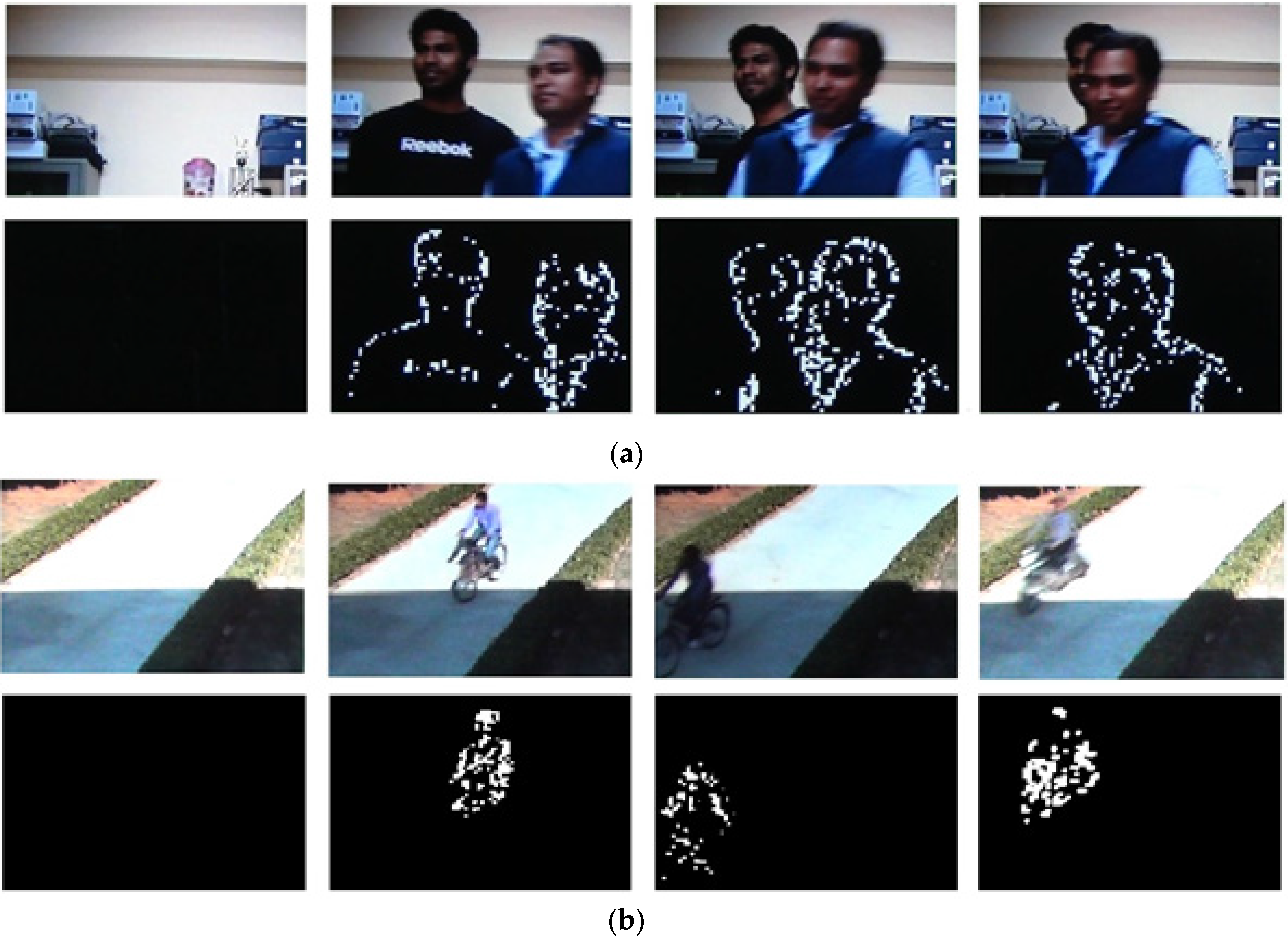 Moving Objects in Video Scene and Corresponding Motion Detected Outputs for Static Background Scenarios.