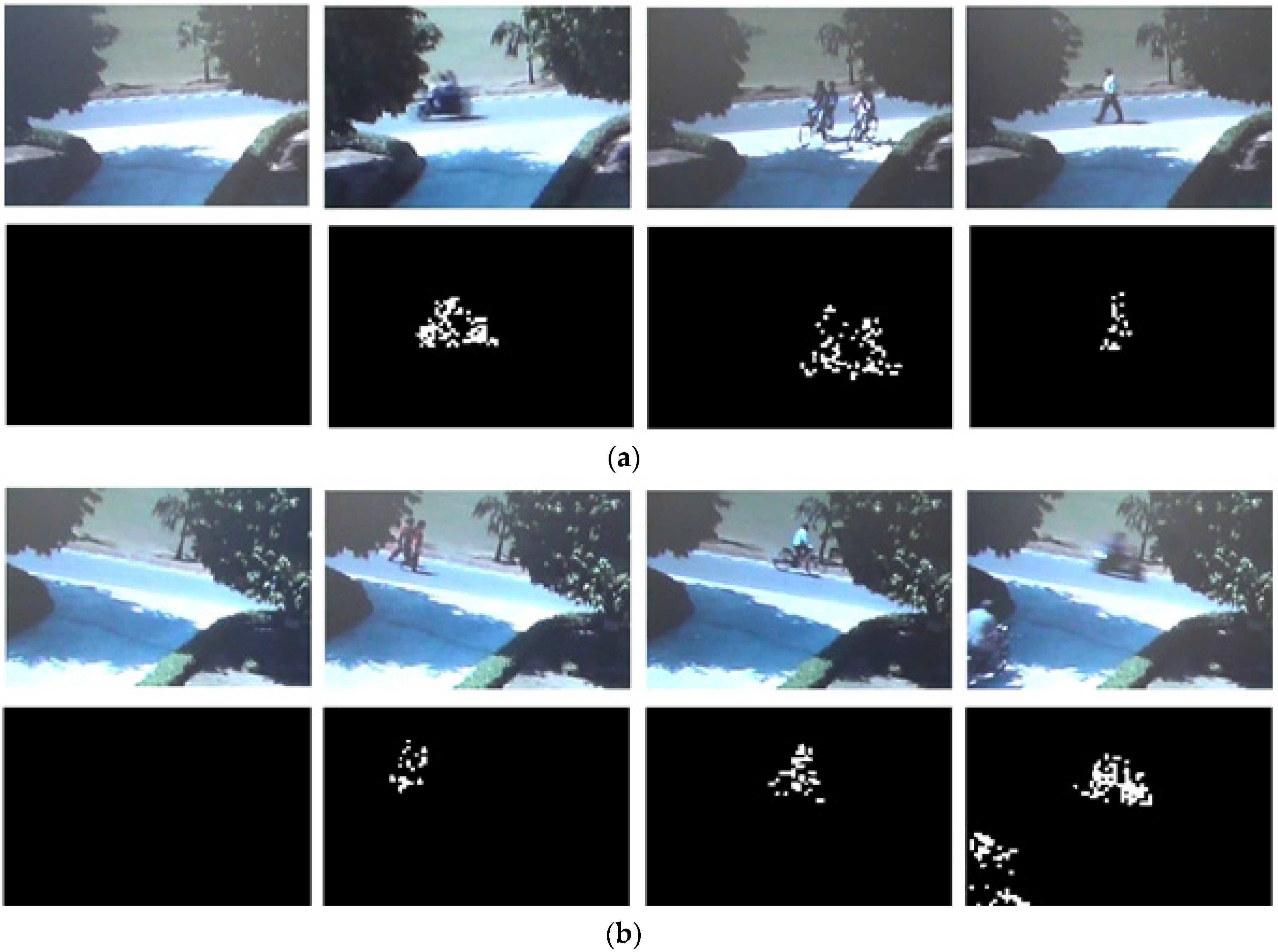 Moving Objects in Video Scene and Corresponding Motion Detected Outputs for Pseudo-stationary Background Scenarios.