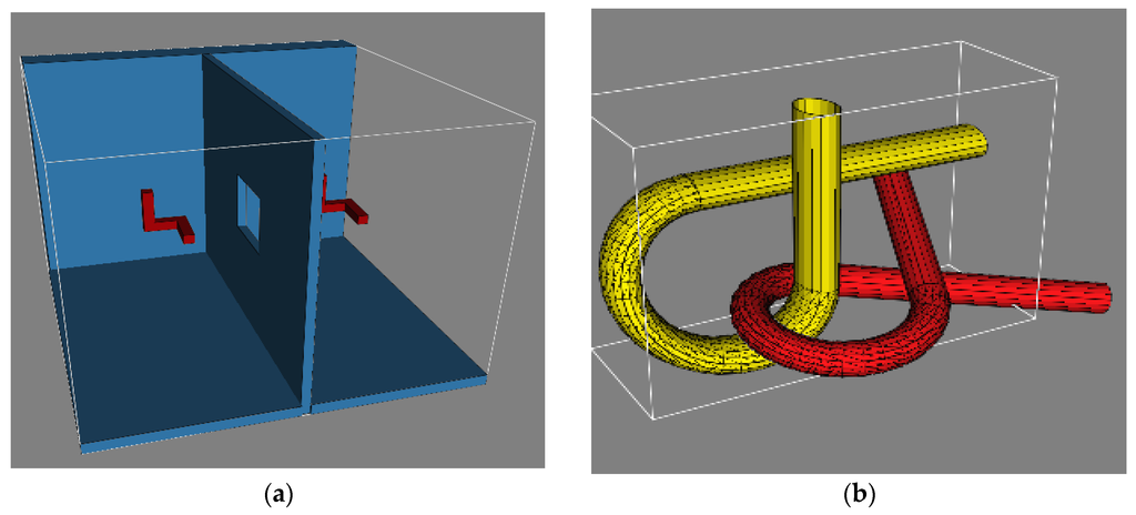 Due to space constraints, only two scenarios are discussed here. The first scenario is called as Twistycool and features a toy robot in SE(3) configuration space that has to surpass a narrow corridor region. The scenario is shown in Figure 1a. The second scenario is the Alpha-1.5 scenario in which a tangled robot has to untangle itself with a similar looking environment. The configuration space is again SE(3). The scenario is shown in Figure 1b. Both the scenarios have a narrow corridor which makes them very difficult to handle. The parameters of the algorithm were fixed by trial and error. The algorithms were executed for different parameter settings. Settings which seemed to perform reasonably well in a variety of scenarios were finally accepted. The values of the parameters are mentioned in Table 1. The value of timeout (T) is kept as 100 throughout.