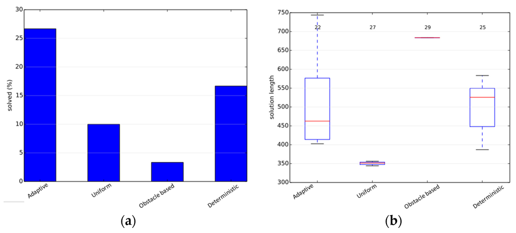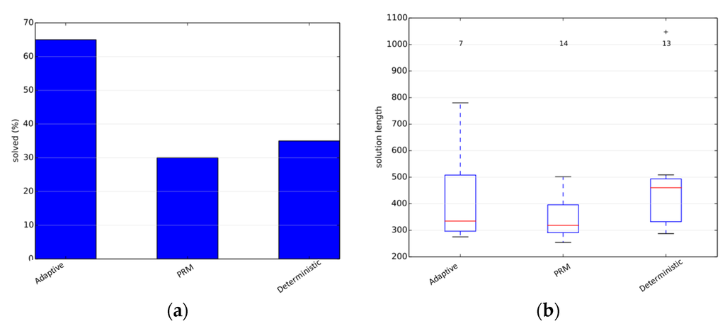 The simulations were performed using the benchmarking libraries provided by OMPL. We first tested our planner on an articulated robot in a three-dimensional environment containing a narrow corridor over the Twistycool benchmark. A total of 20 runs were taken for each algorithm, and the time limit was restricted to 20 s per run. The source and destination configurations for the robot were taken as specified in the benchmarking test suite. In the first scenario, the default PRM planner gives the exact solution in 30% of the total runs, whereas the adaptive planner gives the exact solution in 65% of the total runs, and the deterministically varying planner solves 35% of the total test-cases. Since only few cases resulted in a valid trajectory, the path length metric is not a reliable metric as per our objectives. The results are shown in Figure 2.