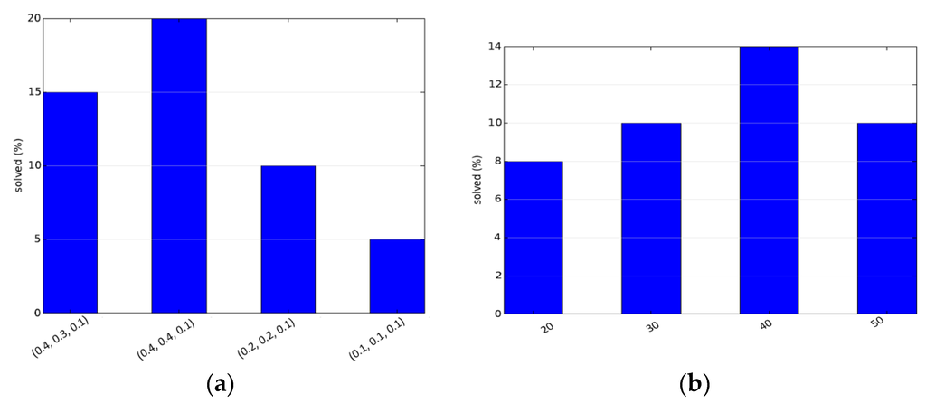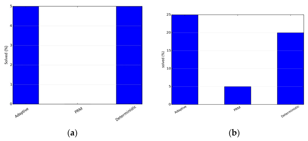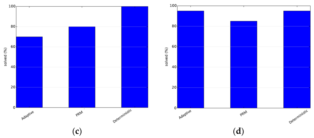 The other set of experiments were run to obtain the optimal set of parameters for the deterministically varying hybrid sampler and the adaptive hybrid sampler. Parameter setting allows us to set the best parameter values and thus achieve the best performance. The parameters of the deterministically varying sampler are the probabilities of the different samplers. Each setting is denoted as a tuple (PO, PG, PM) denoting the initial selection probabilities of the obstacle-based sampler, the Gaussian-based sampler and maximum clearance-Based Sampler, respectively. The initial probability of uniform-based sampler is taken as PU = 1.0 − (PO + PG + PM). The third configuration in Figure 4a is when the probabilities remain constant. A heuristic used in the paper was that the difficult regions should be sampled first, and focus should then be on the easier parts of the configuration space, which was intuitively inspired. The reverse of the same proposal is tried in the fourth configuration of Figure 4a. It can be clearly seen that the two techniques are inferior to the proposed technique for parameter setting. For the adaptive sampler, in order to keep testing simple, αO and αG are kept the same, while αM is kept such that the selection probability of the maximum clearance sampler is 0.1. These constants, when multiplied by density, give the initial selection probabilities. The results are given in Figure 4. The performance can be further improved by better parameter settings.