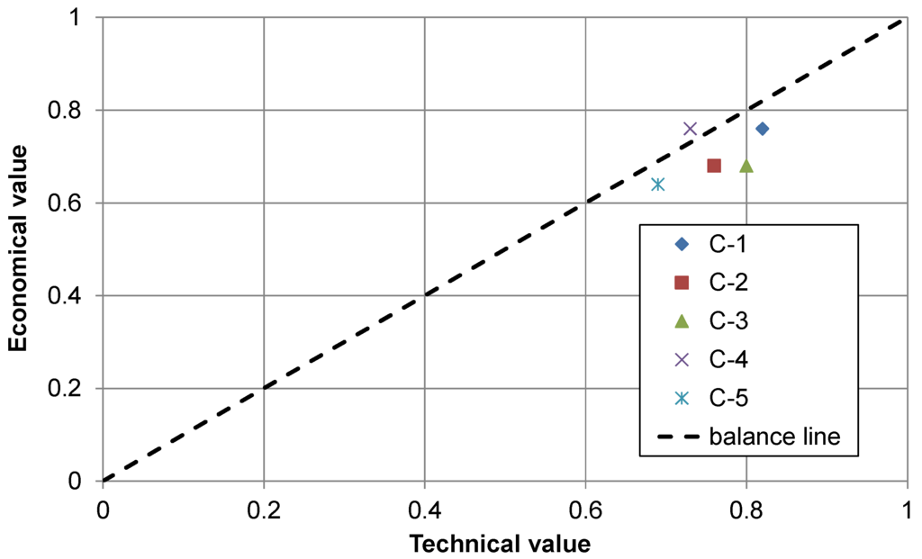 The proposed concepts were evaluated using functional value analysis from the technical and economical point of view. The set of technical criteria contained the following: distance measurement accuracy, velocity measurement accuracy, alert display visibility, power consumption, ease of maintenance, required mounting effort, mounting versatility and aesthetics. The set of economic criteria contained the following: development cost, homologation cost, component acquisition cost, manufacturing cost and marketability. In both cases, the utility function was unweighted. The results of the evaluation are shown in Figure 1.