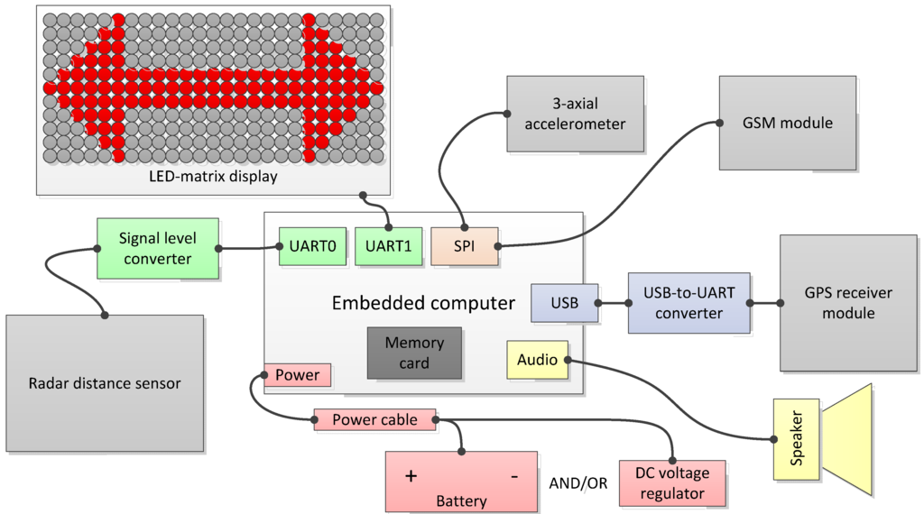 The selected concept of the device is based on an embedded computer and includes an LED-matrix display for visual alert, a radar sensor for distance measurement, a digital accelerometer, a GPS module for velocity measurement, a GSM module for sending distress alerts as text messages and a speaker for host vehicle warnings. It is powered either from the vehicle on-board power system or from a separate battery; it records the data on the built-in memory card and is attached to the vehicle with a suction cup mount. Figure 2 shows the required components and their connections used in the concept.