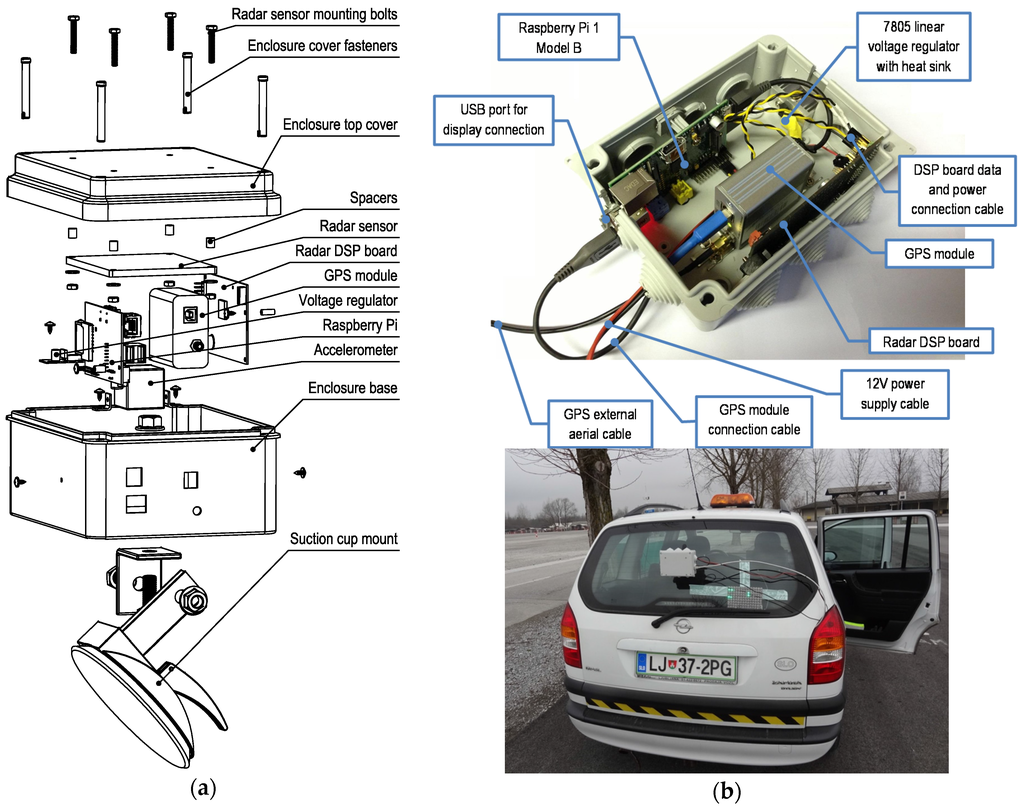 The acquired components were electrically connected and assembled inside a protective plastic enclosure with an attached suction cup for mounting on a vehicle rear window or panel. Research and testing was carried out [20,21] in order to find the correct enclosure material that does not hinder the radar function. It was found out that the 4 mm-thick polypropylene shell of the enclosure is transparent to the RF waves as long as the radar antenna is mounted 6.2 mm from the inner surface of the shell. This distance was achieved by inserting suitable spacers. A 3D model of the prototype device assembly was created for studying and optimization of the component layout within the enclosure. The model, together with the actual assembly of the components in the enclosure and its mounting on a vehicle rear window, is shown in Figure 3.