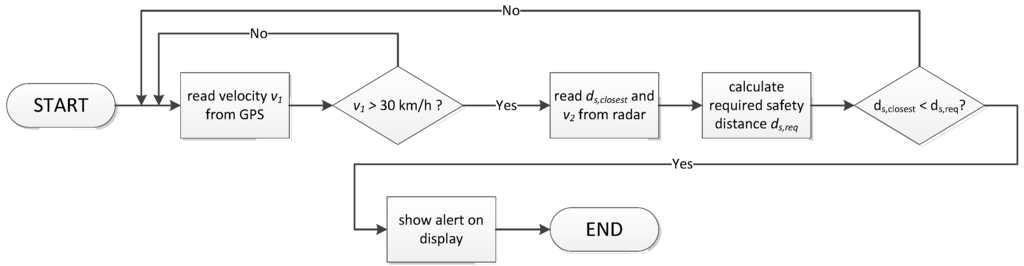 The regulations regarding the required safety distance on roads in most countries include the so-called “two-second-rule” [8,9]. This defines the safety distance to be at least as long as the distance travelled by the vehicle at its current velocity in two seconds. Enforcement of this rule in everyday traffic can be achieved with different measures. In many countries, the safety distance is measured by the police at strategic spots by hand-held radar detectors [10] or by employment of in-vehicle surveillance systems [11]. On selected spots on the highways, there are also test fields that allow the drivers to self-evaluate their safety distance [12]. These test fields are sometimes combined with variable-content traffic signs for visually alerting the drivers about their safety distance. All of those measures are passive and can only be carried out on discrete spots on the road network. A survey of available active measures for continuous monitoring of the safety distance reveals that there is a serious lack of devices for continuous safety distance monitoring. Many of those devices are not easily installable into existing vehicles and are not able to alert the drivers of the trailing vehicles about keeping the required safety distance. Most of those devices are integral parts of the equipment of higher-priced vehicles [13,14,15] and are mostly designed to communicate the safety distance to the driver of the vehicle carrying the device [16] rather than those behind it and violating the safety distance.