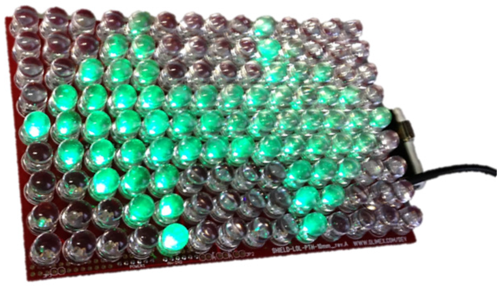 The alert is sent as a command string over the serial connection and interpreted by the matrix display controller firmware. An animated double-arrow (Figure 6) is shown followed by the scrolling “KEEP DISTANCE!” message. This sequence runs in a continuous loop until the condition in Equation (2) becomes false again.