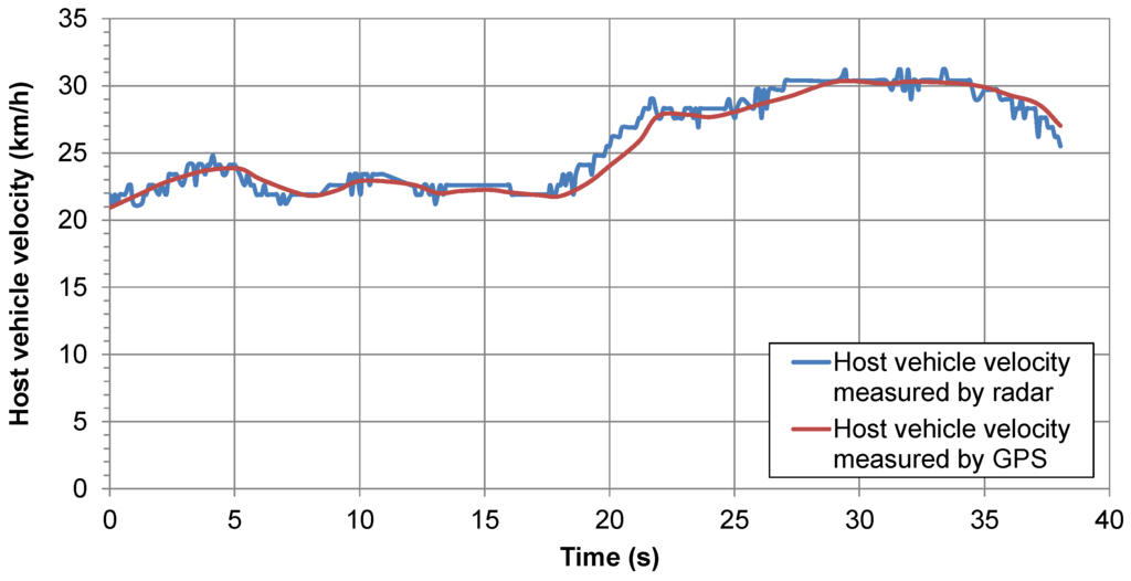 In the first test, the host vehicle velocity was simultaneously measured with the radar sensor and the GPS. Figure 7 shows an excerpt from one of the measurements, where it can be observed that the agreement between the two curves is generally very good. The slight time shift occurs due to the GPS velocity being sampled only twice per second due to a limitation imposed by the GPS receiver used in the prototype. The mean values of magnitude (excluding the radar sensor noise) follow each other with an average relative error of 3.12%, which is well within the required 10% relative error margin.