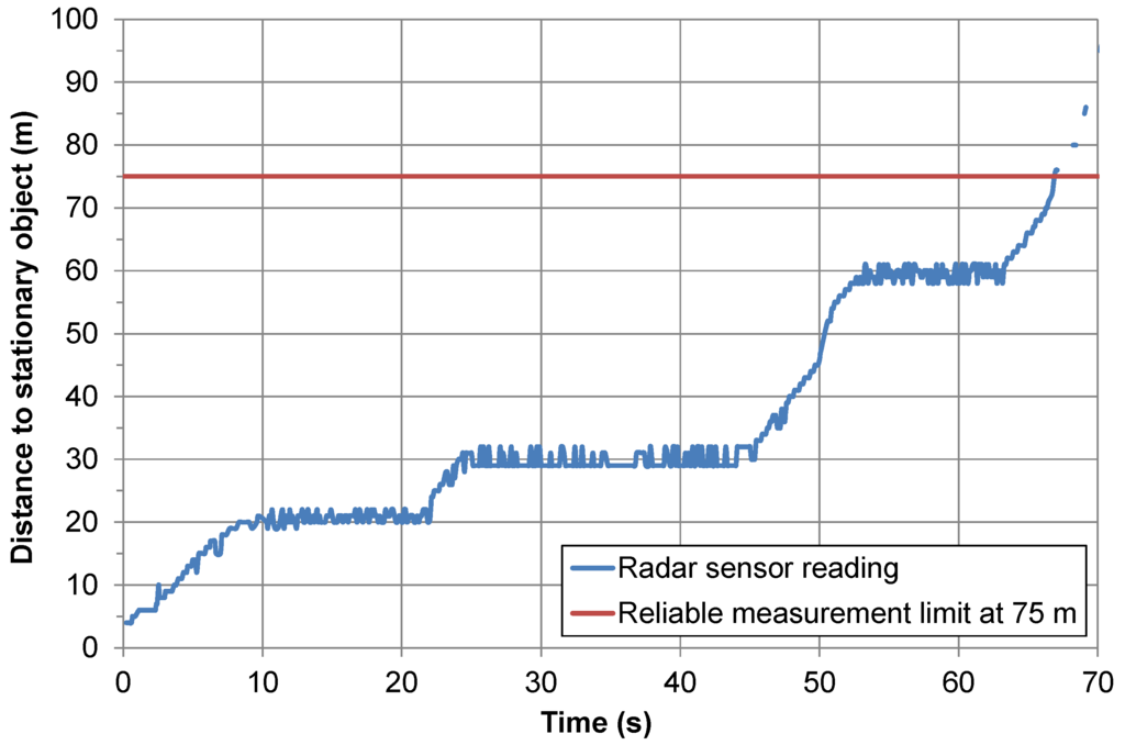 Similar measurements were done with a stationary passenger car as the target object. In those measurements, the upper limit of the maximum reliable measurement range was also between 70 and 80 m.