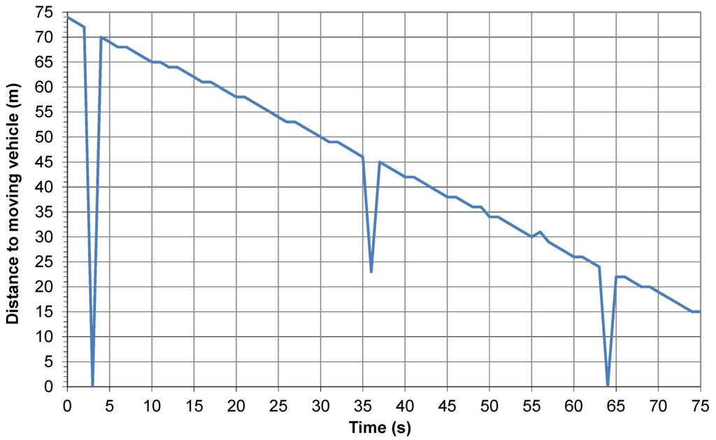 One of the requirements was also a reliable, disturbance-free distance measurement throughout the whole measuring range of the radar sensor. To test this, the device was mounted on the host vehicle driving in a straight line at 30–40 km/h while the trailing vehicle was approaching it from behind with a constant relative velocity of approximately 0.8 m/s. During the test, the distance of the trailing vehicle to the host vehicle has thus approximately linearly decreased from 75 m down to 15 m. The time vs. distance curve is shown in Figure 9. It can be observed that the otherwise prevailingly straight curve contains three significant anomalies at approximately 71 m (reading 0 m), at approximately 46 m (reading 23 m) and at approximately 23 m (reading 0 m). After some research and discussion with the radar sensor manufacturer, it was determined that the interference most likely comes from the MAX232 RS-232-to-TTL converter chip on the sensor DSP board. To remedy this, the known false readings of 23, 46 and 71 m were filtered out in the final version of the device software and substituted by interpolating the adjacent readings. This does not significantly hinder the device performance, as the distance between vehicles in normal traffic is dynamic and, thus, the probability of remaining at exactly the filtered-out values for any prolonged time is fairly low.