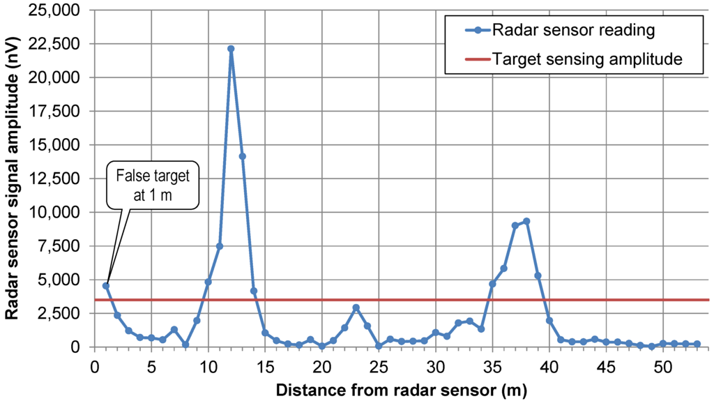 The same test setup was also used to determine the influence of the driving surface itself on the distance measurement. Due to the shape of the microwave propagation field of the radar transceiver [18], it was expected that the nature of its mounting on the host vehicle may cause the detection of the driving surface as one of the targets, thus causing false alert triggering. To determine this, the signal amplitude vs. distance chart was drawn. Figure 10 shows an example where two vehicles were located at distances of 12 m and 37 m from the radar sensor. The target sensing amplitude threshold in this case was set to 3500 in order to reliably sense the targets, but this setting almost always returned a target at the distance of just over 1 m, determined to be the reflection of the driving surface. To overcome this, the targets closer than 3 m were subsequently programmed to be filtered out in the final version of the device software.
