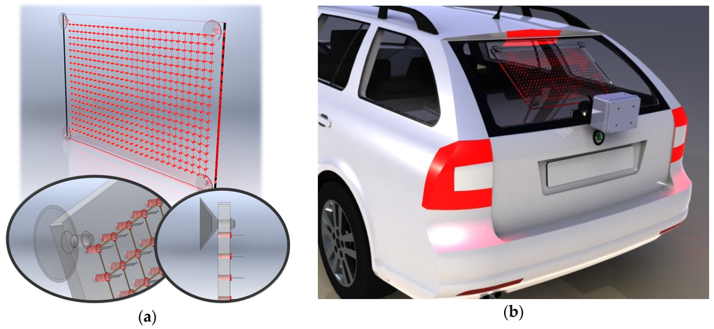 Model of the proposed transparent display design. (a) LED-matrix detail; (b) mounting on the rear window of a vehicle.