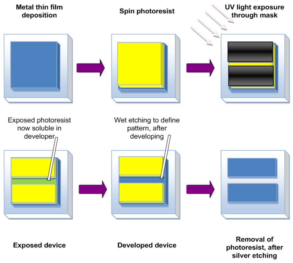 Commercially available microscopic glass slides were well cleaned following the well-established protocol. This involved rinsing glass slides in Deionized (DI) water (SILEXTM deionizer, Dayton, OH, USA), acetone (Sigma Aldrich, Lahore, Pakistan), ethanol (Sigma Aldrich, Lahore, Pakistan) and finally again in DI water for 5 min each. To dry the glass substrates, nitrogen gas (Fine gas company, Lahore, Pakistan) was blown on them in a dust free environment. Edward Auto 306 thermal evaporator (Edwards High Vacuum, Sussex, UK) was later used to deposit thin film of silver on the glass substrates. A film thickness of 200 nm was obtained by passing 22A current through the tungsten filament for ~2 m. Meanwhile the pressure inside the thermal evaporator was kept below 10−5 mbar. Silver thin film was then subjected to optical lithography so as to pattern it into a pair of electrodes. The standard lithography procedure was adopted to define the pair of electrodes with two distinct configurations, i.e., rectangular and interdigitated. Figure 1 summarizes the whole lithographic for patterning the silver film into a pair of rectangular electrodes separated by a gap of ~20 μm. The same procedure was adapted to pattern the silver thin film into a pair of interdigitated electrodes.