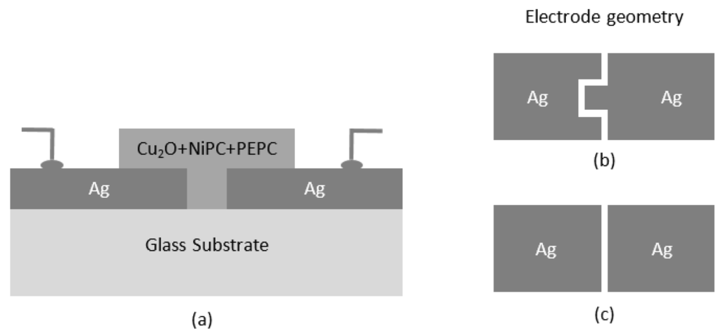 (a) Cross-sectional view of organic-inorganic hybrid composite based humidity sensor; top view of (b) interdigitated and (c) rectangular electrodes configuration.