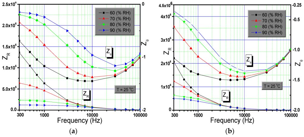 Figure 4a,b shows the relationship of the real component of impedance and phase angle with humidity for the humidity sensors with interdigitated and rectangular electrode configuration, respectively. The response was studied with the input signal’s frequency ranging from 300 Hz to 100 kHz. It can be inferred from the experimental data that at low frequency of input signal, the impedance spectra of both sensors exhibits a strong reliance upon the humidity level. The real component of sensor’s impedance (ZR) decreases quite sharply with the increase in humidity level. However, at high frequency, only a slight decrement of ZR is observed with increase in humidity level.