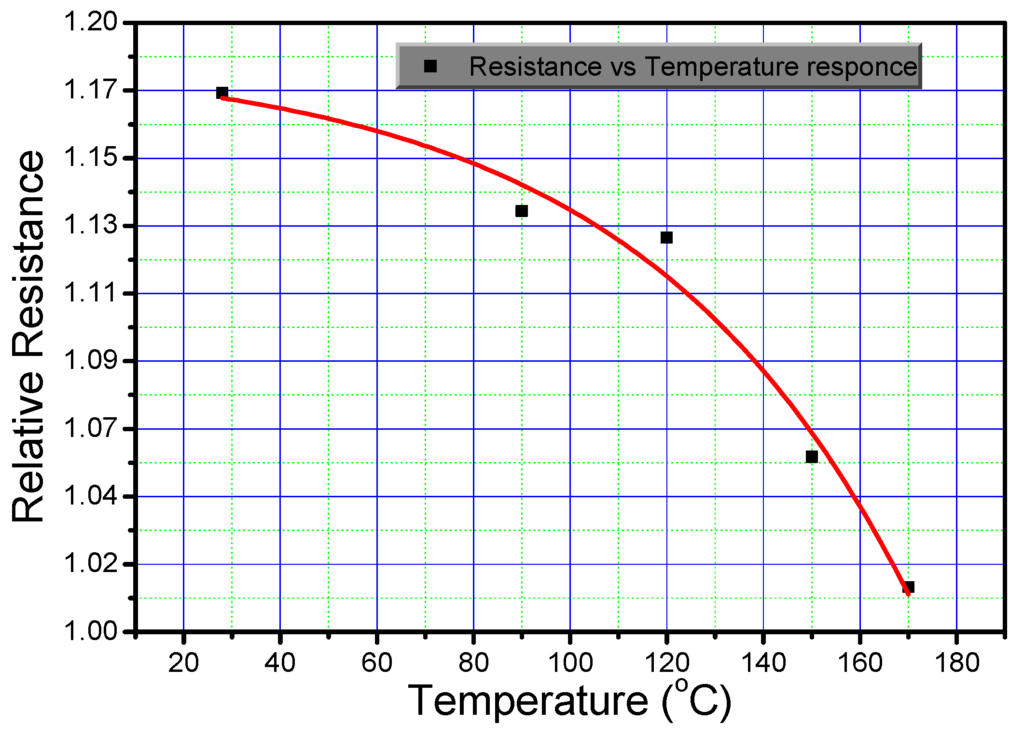 It is known that ambient temperature greatly affects the resistance of the materials, and thus it is supposed to affect the impedance of the humidity sensor as well. Figure 5 portrays the resistance of the humidity sensor at various temperatures, when subjected to 60% RH. It is worth noting that by utilization of sealed chamber, the RH inside the chamber remains unaffected when the sensor is subjected to elevated temperatures (as observed through humidity meter placed inside the chamber). It can be clearly seen from experimental results that the resistance of the organic-inorganic blended film showed a slight decrease (from 538.9 KΩ to 465.5 KΩ) in its value with temperature elevation (from 30 °C to 170 °C). The decrease in resistance of the device indicates the semiconducting nature of sensing film and the trend may be attributed to increased charge carrier mobility at higher temperature. The resistance variation has been measured to be ~1.17 times in the temperature range of 170 °C to 30 °C. In sealed environment, it is assumed that sensor design may be suitable for elevated temperature applications as well. Further, the environmental temperature normally does not vary much, so we propose, for the practical application of our fabricated humidity sensor, that the temperature compensation may not be required.