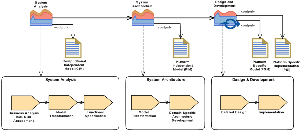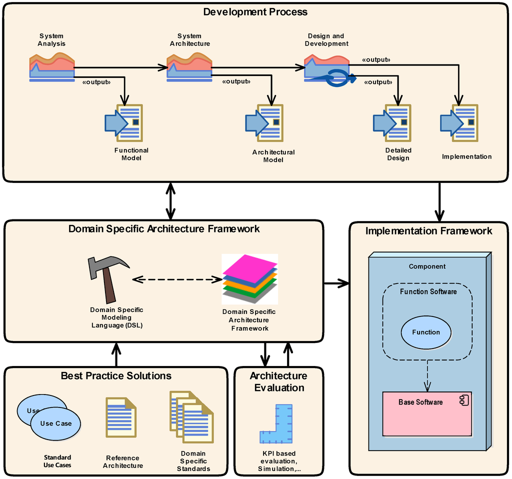 However, even if the mentioned development phases are clearly separated, it is necessary to provide a unified and consistent development environment that allows for example a traceability of certain (System level) requirements down to particular components or development artefacts. The necessity for such a unified development environment stresses the need for a holistic and consistent Domain Specific Architecture Framework.