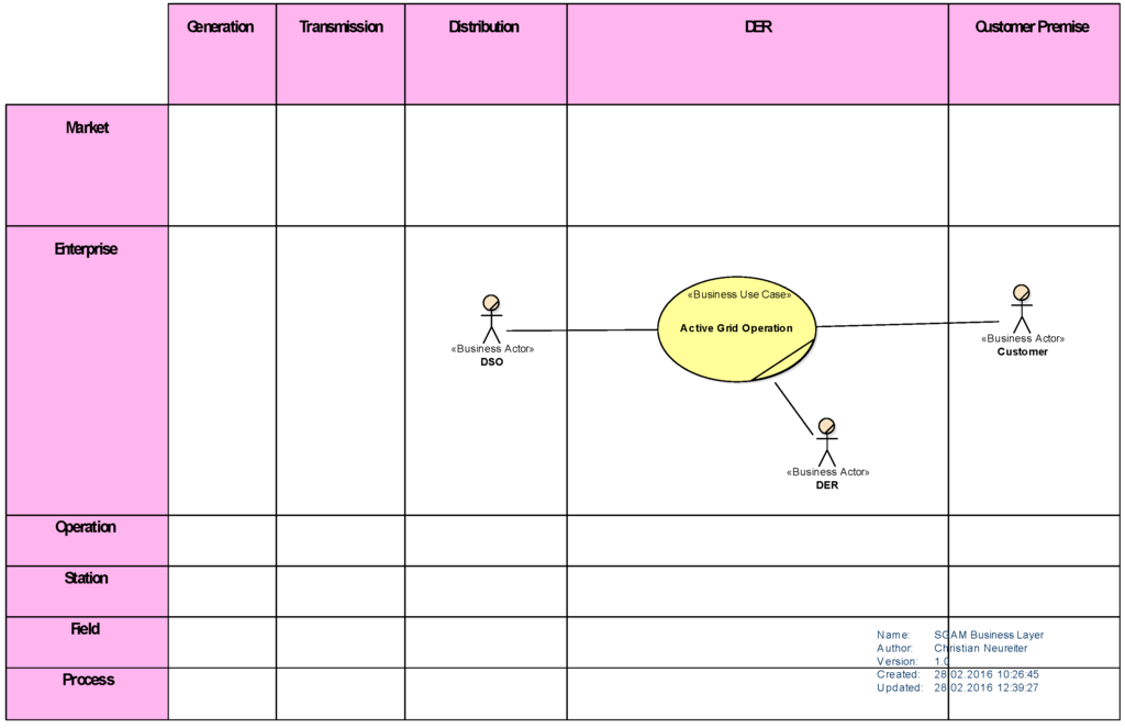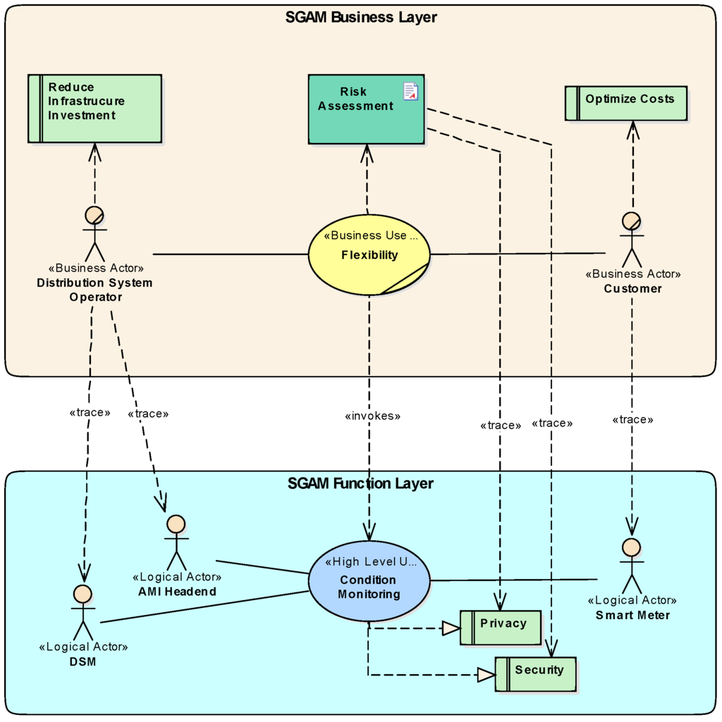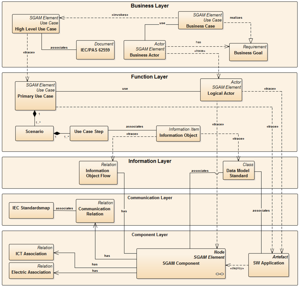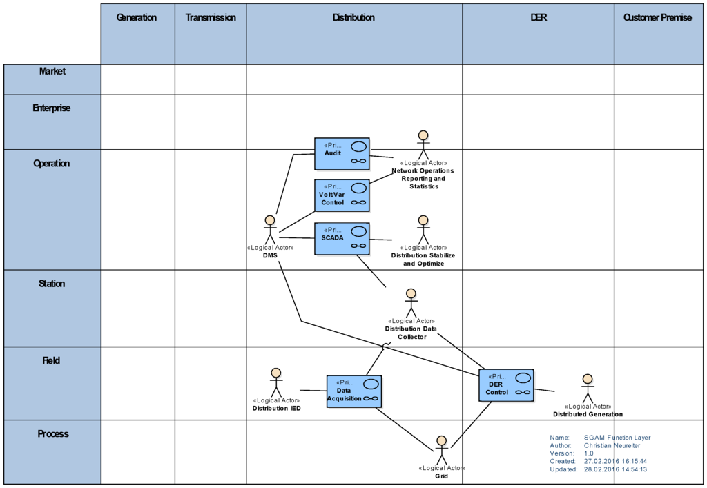 The individual steps described so far demonstrate step-by-step modeling of a Smart Grid solution. In terms of the SGAM, the model has been developed layer-by-layer. By maintaining vertical relations (“traces”, reflecting model transformations) between the individual layer, a complete model can be obtained. Figure 28 depicts selected aspects of the example model on basis of a “front view” (e.g., looking from the front on the SGAM cube).