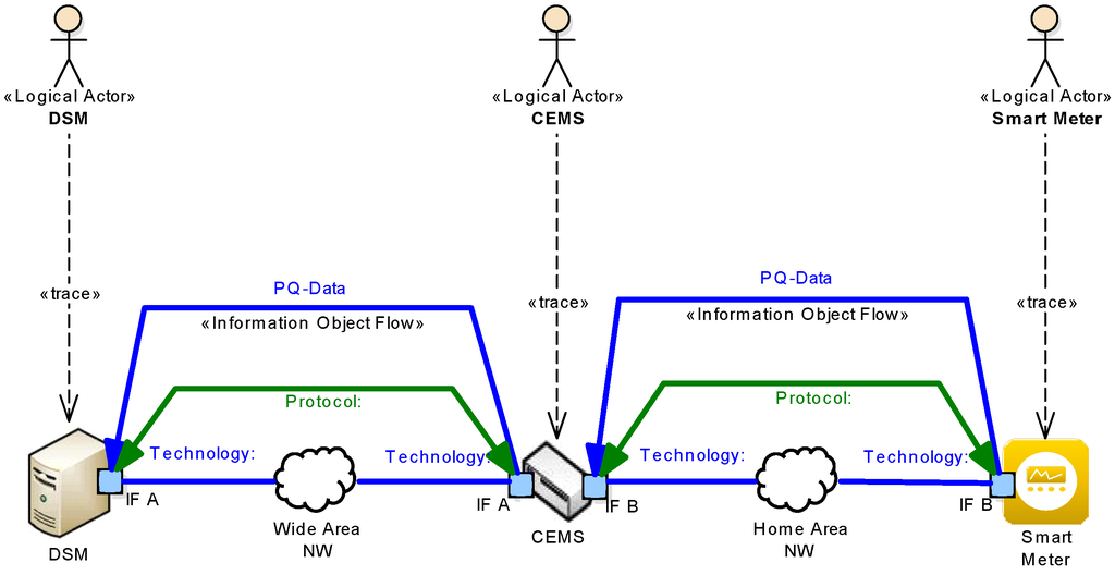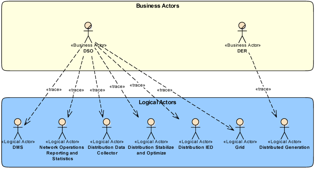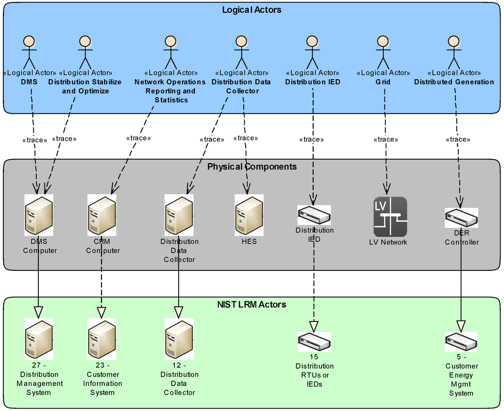 As one can see in the figure, the mapping is not necessarily a one-to-one mapping. Rather, one single LA (as for example “Distribution Data Collector”) can be realized as combination of multiple physical devices (“Distribution Data Collector” and “Head End System”, HES). Vice versa, it is also possible for one physical component to realize the functionality of different Logical Actors (e.g., the “DMS Computer” realizes the LAs “DMS” and “Distribution Stabilize and Optimize”).