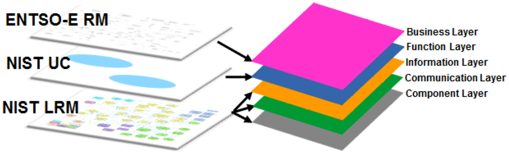As motivated in Section 1, the goal of the presented approach is to provide a domain specific engineering framework with respect to architectural concepts from standardization bodies. Moreover, contributions from both, American and European standardization bodies are incorporated into a Domain Specific Language which states the backbone of this approach. Even if already some DSL based approaches exist [41,42], to our best knowledge we are not aware of any other approach that obtains a Smart Grid specific DSL on basis of standardization work. Or, as presented in this approach, on basis of a combination of both, standardization work from Europe (SGAM) and America (NIST LRM). However, according to the focus of this paper, this section briefly introduces various concepts proposed by standardization bodies that contribute to the presented approach.