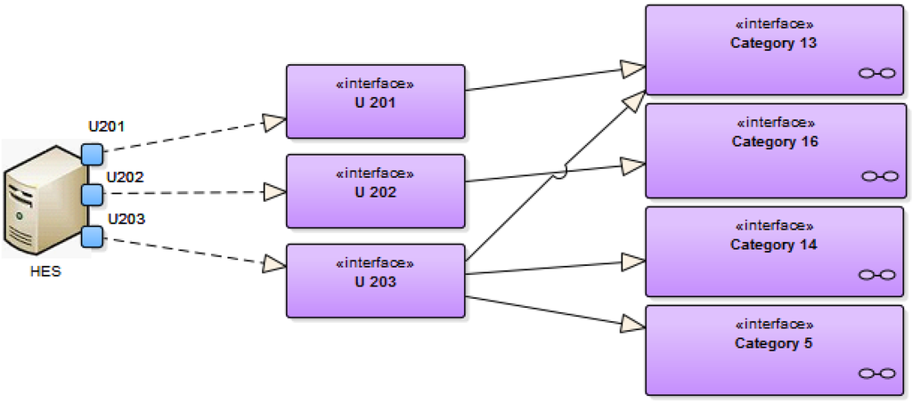 When introducing a new component it is necessary to identify and describe the interfaces with surrounding components. In the given example, the HES will be interfacing with three components (DDC, DMS and DER). Thus, the three interfaces U201, U202 and U203 are created and instantiated for the HES. Furthermore, each of these interfaces is considered in respect to the available interface categories discussed in Section 2.3. After the appropriate interface categories have been identified, the interfaces can be related with them. Doing so provides a direct link between the newly created component and the associated security requirements delivered by the NIST LRM. Figure 23 depicts the creation of Interfaces and their relation with particular Interface Categories for the newly created component HES.