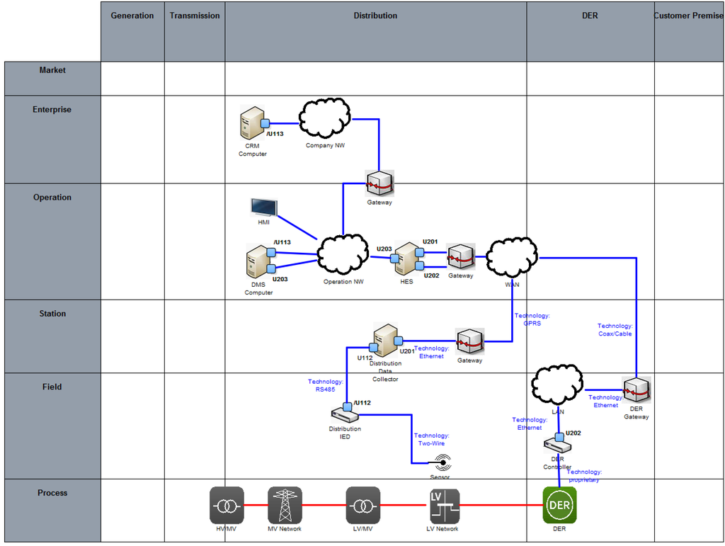 - Customer Premises: Hosting both-end users of electricity, also producers of electricity. The premises include industrial, commercial and home facilities (e.g., chemical plants, airports, harbors, shopping centers, homes). Also generation in form of e.g., photovoltaic generation, electric vehicles storage, batteries, micro turbines, etc., are hosted.