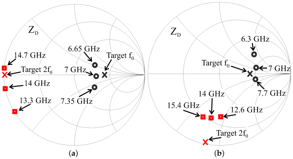 Optimum fundamental (black cross) and second harmonic (red cross) loads for the 8 × 75 m device, for Tuned Load (a) and Harmonic Tuned (b) designs. Synthesized loads at fundamental (black circles) and correspondent second harmonic (red squares) in a 10% bandwidth for the Tuned Load case, and in a 20% bandwidth for the Harmonic Tuned case.