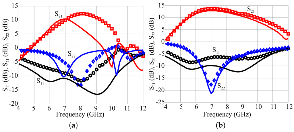 Scattering parameters in the band 4–12 GHz. Tuned Load (a), Harmonic Tuned (b) Power Amplifiers (PAs). Simulations: solid lines; measurements: symbols. : black circles, : red squares, : blue diamonds.