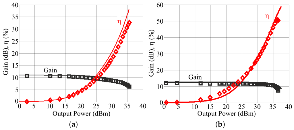 Single tone characterization results, compared with simulations, are reported in Figure 6a,b. The saturated output power is of 35.6 dBm and 36.6 dBm, with a corresponding efficiency of 33% and 50%, and a small signal gain of 10.7 dB and 12 dB for the Tuned Load and Harmonic Tuned PA, respectively.