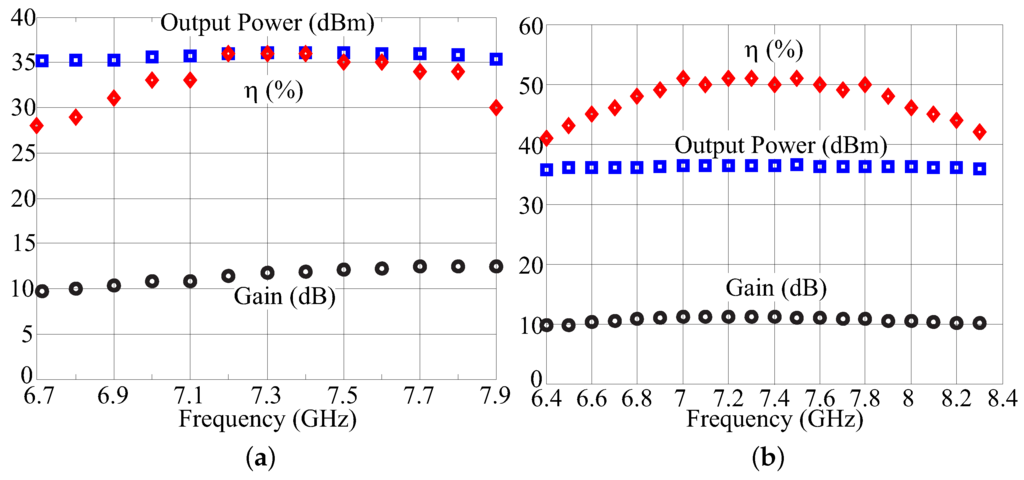 Figure 7a,b show the Continous Wave performance vs. frequency of both MMICs. Regarding the Tuned Load PA, the saturated output power results are higher than 35 dBm in the 6.7–7.9 GHz band, while the saturated efficiency is higher than 35% in the 7.2–7.6 GHz band. On the other hand, the Harmonic Tuned PA exhibits an output power in excess of 36 dBm from 6.4 to 8.3 GHz, with saturated efficiency higher than 50% in the 7–7.8 GHz range.