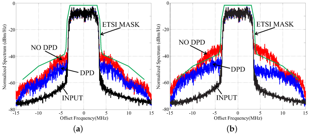 Normalized power spectra from system level measurements without (red) and with digital pre distorter (DPD) (blue, polynomial order 3, memory depth 0). Tuned Load amplifier (a), Harmonic Tuned amplifier (b). Applied baseband signal: 256-Quadrature Amplitude Modulation, 7 MHz channel, Peak to Average Power Ratio of 7.4 dB (black). For reference, ETSI 6L standard emission mask is reported in green.