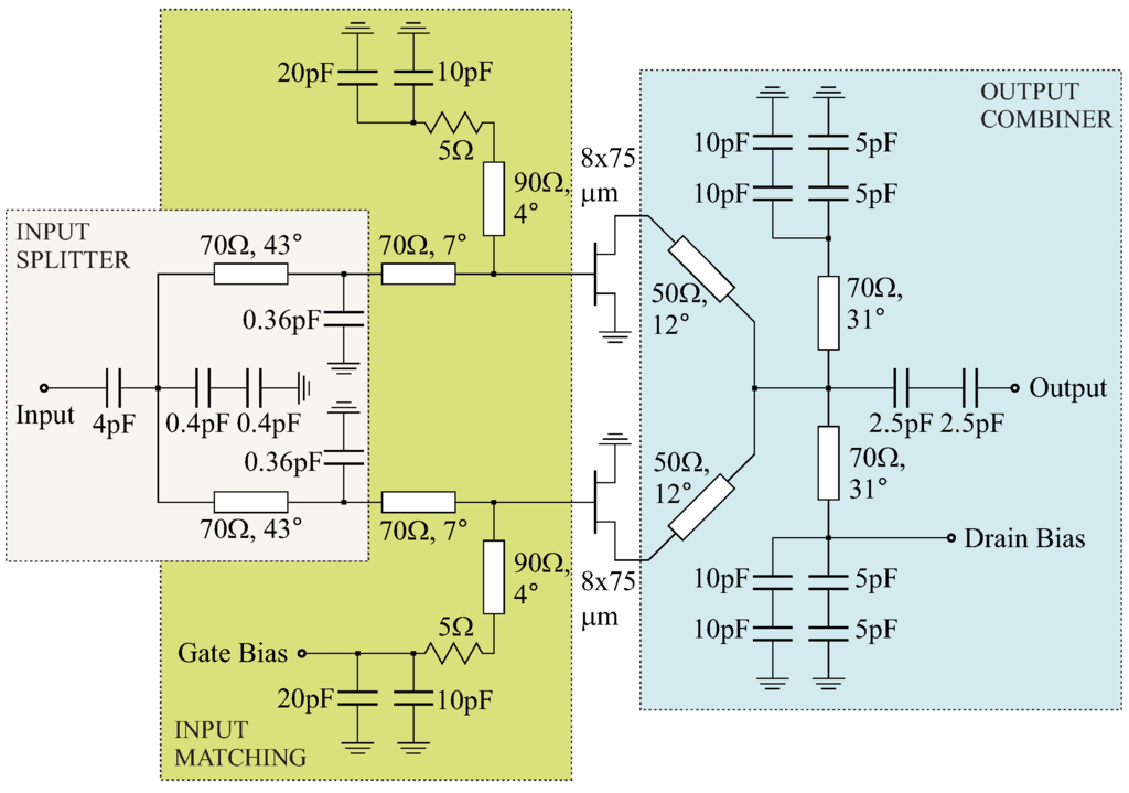 The output combiner, the drain bias stub (actually splitted in two symmetrical stubs), and the decoupling capacitors are designed to provide output matching and to supply drain bias. Input matching and broadband stabilization are provided by a short stub on the gate side, with a series resistance of 5 Ω, while large by-pass capacitors are used to guarantee good isolation also at low frequencies. The input power divider is a semi-lumped splitter. Since the needed input capacitance resulted to be very low, two larger series capacitors have been employed to improve the robustness of the circuit.