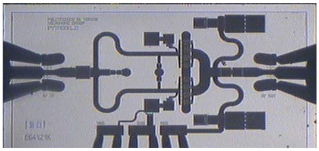 Microscope picture of the 15 GHz (2.3 × 1.3 mm) MMIC combined amplifier.