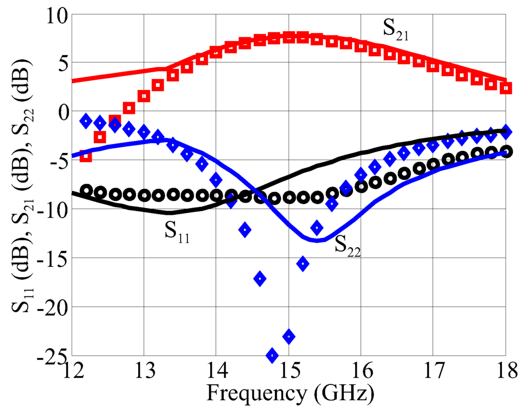 Figure 11 shows the measured scattering parameters, compared with the simulations, of the 15 GHz combined PA, with drain bias of 30 V, 30 mA, in the 12–18 GHz band. It can be seen that the gain is higher than 6 dB from 14 to 16 GHz.