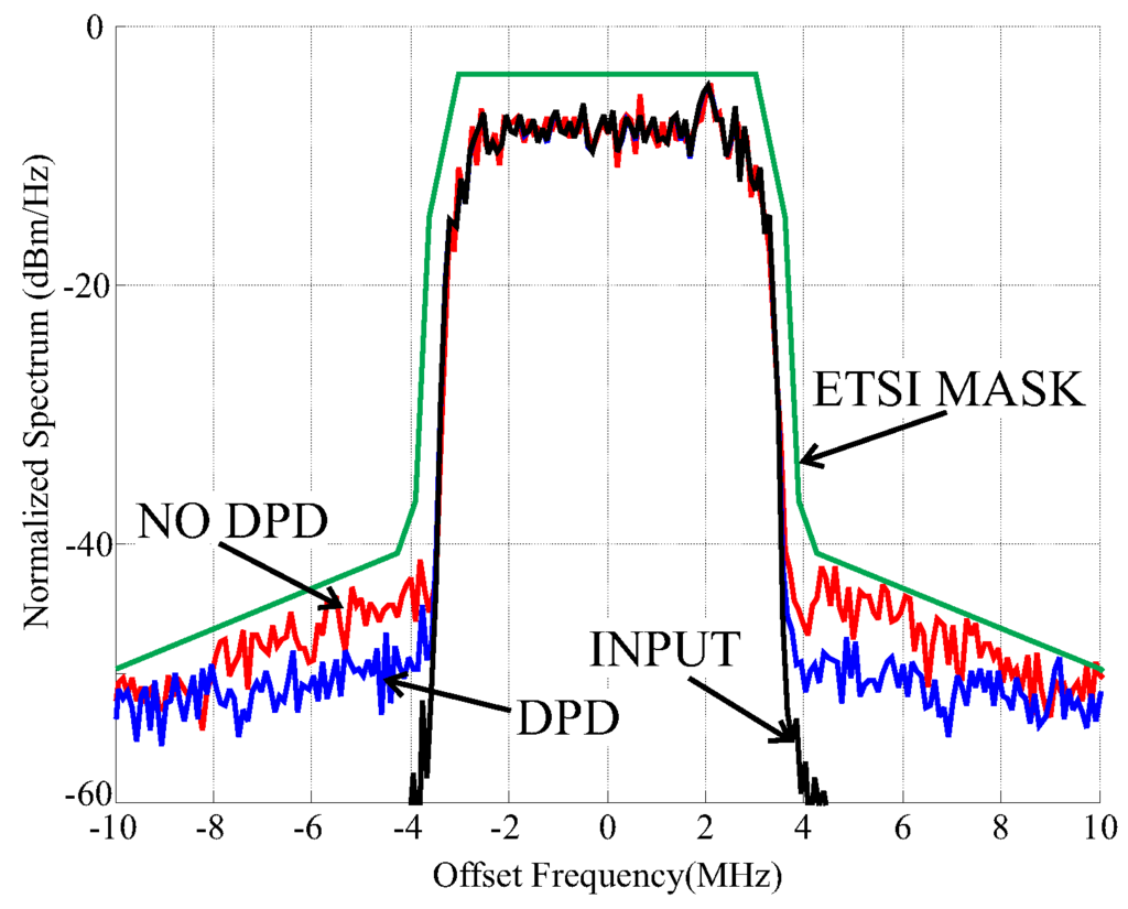 The adopted system-level characterization set-up includes an arbitrary waveform generator (AWG) that generates the microwave modulated signal, a receiver based on a vector signal analyzer (VSA), and a workstation (PC) for the elaboration of the data. The input data stream is loaded into the AWG, modulated, up-converted and sent to the amplifier input. The VSA receives the output data stream, and computes after down-conversion and demodulation the required system level FoMs. The two PAs have been measured applying a 256-QAM, input signal with 7 MHz of channel and Peak to Average Power Ratio (PAPR) of 7.4 dB. The MMICs have then been modeled and predistorted with a memory polynomial model well adopted for its simplicity that makes it well suited to FPGA implementation. The linearity have been tested applying the simplest predistorter required to comply with a standard ETSI spectrum emission mask for a 7 MHz channel signal (the maximum affordable with the available measurement setup) with raised-cosine filter, roll-off of 0.2, 256-QAM modulation and PAPR of 7.4 dB (see [15], p. 29, mask type 6L). The resulting spectra are shown in Figure 8.