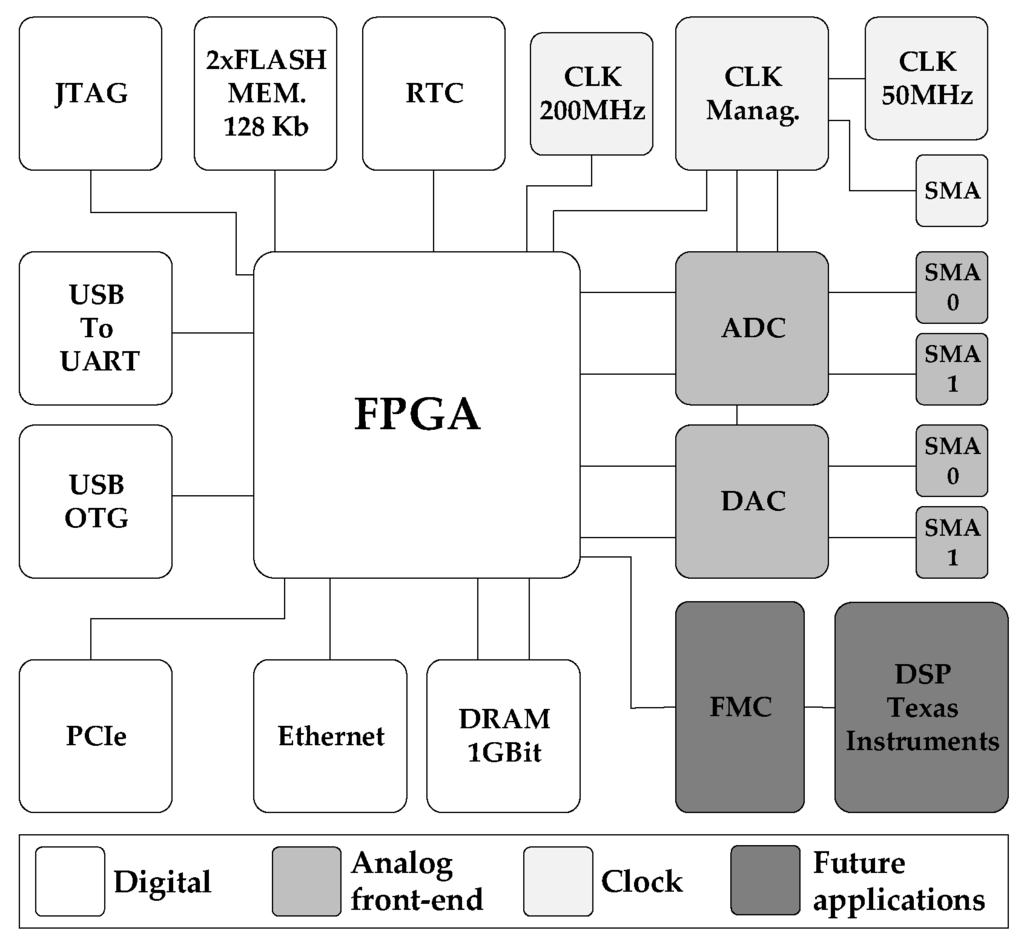 The platform presented in this work has a good trade-off between performance and cost. To do that, main components or subsystems, such as ADC, DAC, FPGA and clock, are pin-compatible with other families of the same manufacturer to adjust the performance and price to the application. This allows us to decide which ones can be assembled.