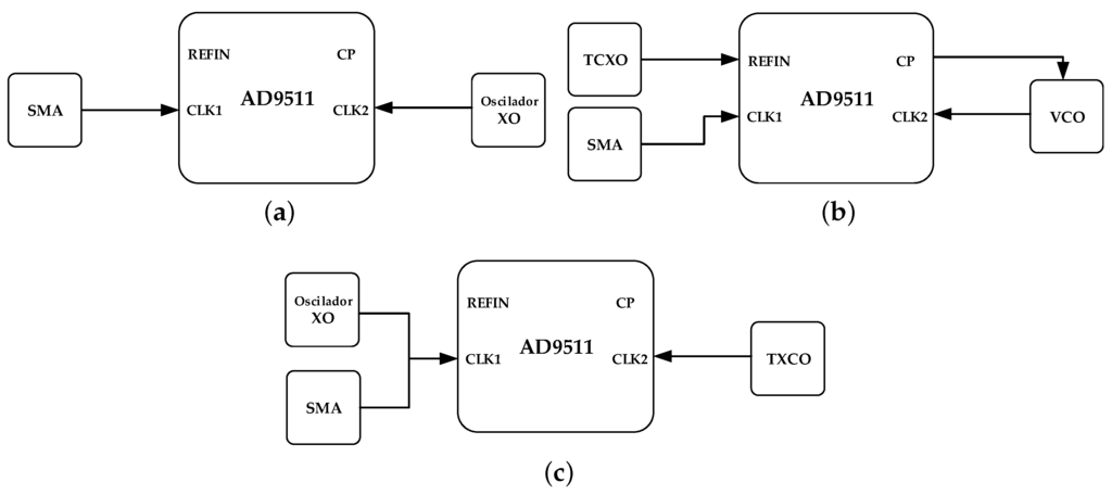 Figure 2. Clock input diagram of the clock distributor: (a) Crystal Oscillator scheme; (b) VCO using an accurate Temperature Compensated Crystall Oscillator (TCXO); (c) TCXO.