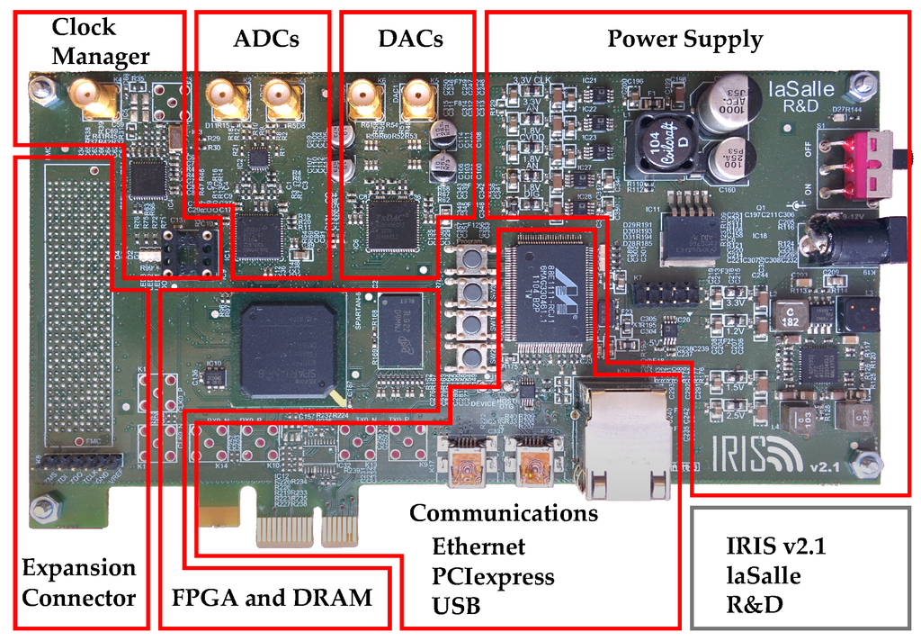 IRIS is a platform that was designed with the maximum flexibility in order to be used for both educational [11] and research purposes. Several platforms have been implemented for educational purposes previously such as [12,13,14] . In order to perform all the SDR applications desired, which involve Multiple-Input Multiple-Output (MIMO), the platform requires 2 high speed Analog to Digital Converters (ADCs), 2 high speed Digital to Analog Converters (DACs), and supports different clock input signals and different communication ports enumerated below: