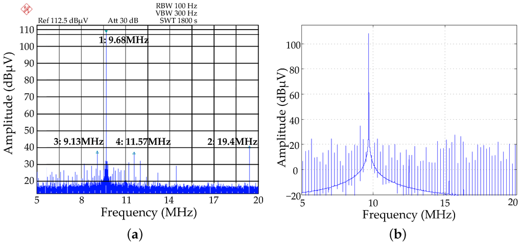 Figure 9. DAC performance analysis carried out injecting a single tone of 9.68 MHz with a DDS and measuring the output with an spectrum analyser: (a) DDS injected in the DAC inputs by the FPGA; (b) ideal DDS generated by the FPGA to analyse the DAC performance