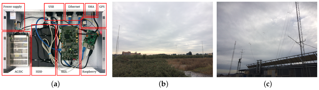 Figure 10. Low cost transmitter installed in Cambrils, Spain, 400 km away from the receiver, Barcelona, to test NVIS radio-communications: (a) a picture of the whole digital radio-modem based on the IRIS platform; (b) the wideband HF folded dipole placed at the transmitter side; (c) the wideband HF folded antenna with the balun placed in the receiver side.