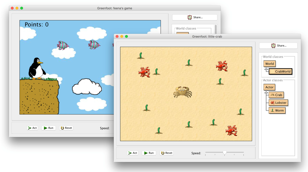 The Greenfoot framework was designed to make the creation of interactive, animated graphics and production of sound easy for programming novices. This enables the creation of two-dimensional video games and simulations. Figure 1 shows two simple examples that can be used for early introduction of programming concepts, each with a keyboard controlled game character. The examples illustrate two classes of typical games, a birds-eye view game and a platform jumper game. Game characters (classes and their objects) can be created interactively, and character behaviour is programmed in Java. Greenfoot provides simple movement, control and collision detection methods to enable novice programmers to create the first interactively controlled graphical characters within a few minutes.