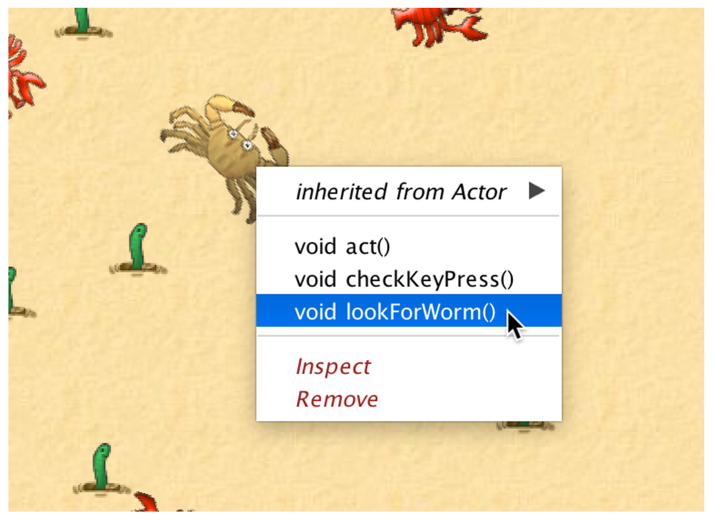 Interactive method calls. A right-click on an object in the world posts a popup menu that displays the object’s public methods. These methods can be interactively selected to be invoked.