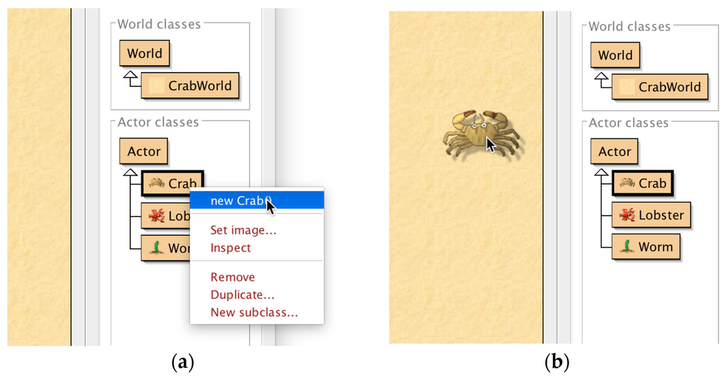 Object creation: Objects can be interactively created by right-clicking a class and choosing a constructor (a); the resulting object can then be dragged into the world and placed there (b).