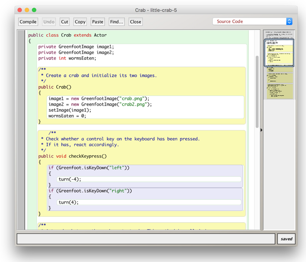 Source code is displayed in Greenfoot by opening the editor for a class (Figure 5). The source is standard Java code.