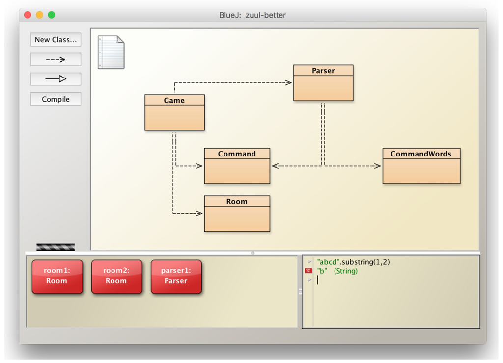 The purpose of BlueJ is to provide a thorough introduction to the foundations and principles of object-oriented programming. The environment is designed with pedagogical goals in mind, to support the understanding and mastery of object-oriented principles. Where Greenfoot’s foremost aim was to create engagement and motivation by providing special support for one particular class of application, BlueJ aims to facilitate a full understanding of principles and details of object-oriented programming. No framework code is automatically provided (as it is in Greenfoot), so there is no “magic”, and no restriction as to what kinds of programs can be created. BlueJ is a general purpose IDE. While Greenfoot was aimed at drawing people in to programming who previously may not have thought they would like it, BlueJ’s target user group are novices who have decided they want to learn more, and achieve a deeper understanding.