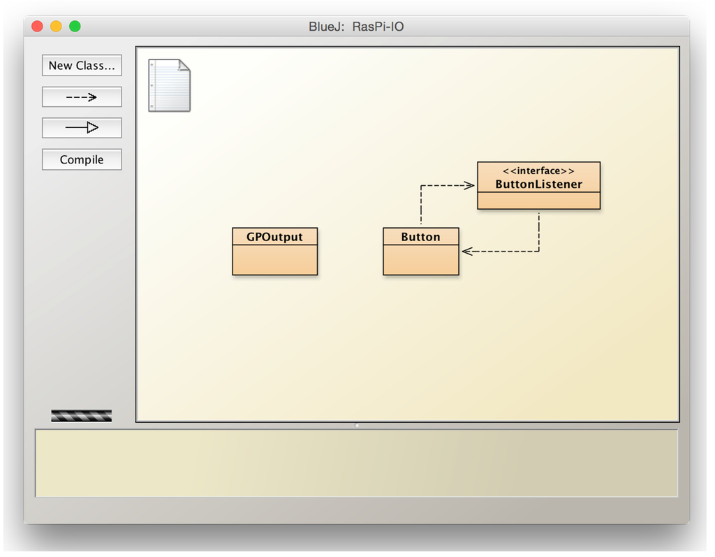 BlueJ interfaces with the Raspberry Pi via a (slightly modified version of) the Pi4J library [22], which is included by default with the Raspberry Pi BlueJ version and does not need to be installed separately. In addition to the resulting ability to access the Pi4J interface directly (documentation for this is available online [23]), we provide a set of classes that represent physical components. Once the BlueJ project has been opened that provides these abstractions, users can interact with these components by interactively creating objects and invoking their methods. They can also write code to perform more complex actions.