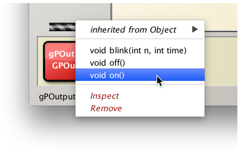 Figure 8, for example, shows classes representing output devices connected to the general purpose I/O (GPIO) pins and buttons (which may also be connected to the GPIO pins). If we now, for instance, connect a LED to a pin on the Raspberry Pi, we can create an object of class GPOutput, specifying the pin number in its constructor, to represent the LED. This LED will now be represented in BlueJ as an object on the object bench, and methods can be called interactively on this object to communicate with the LED (Figure 9).