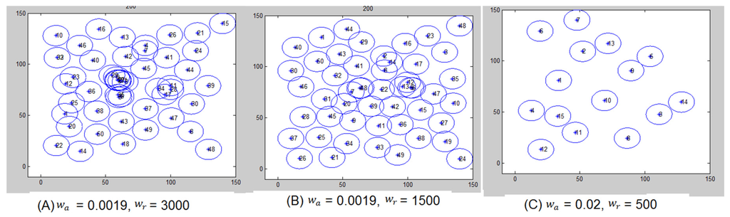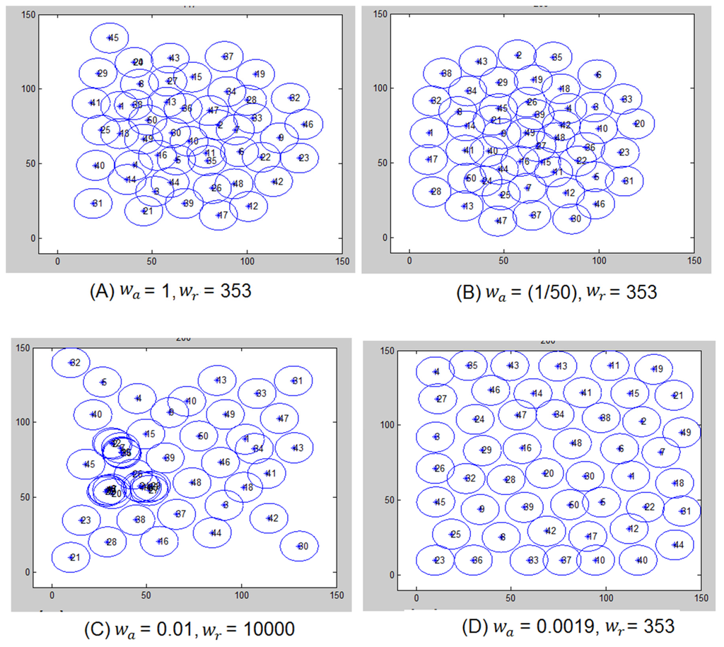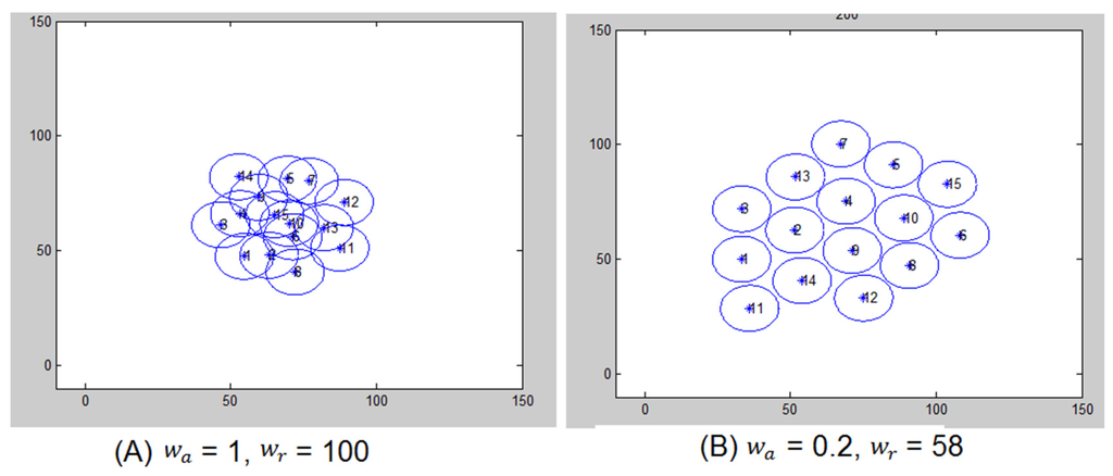 In the virtual force computation, if robots are far from each other by a distance threshold, which is determined specific to system requirements, the robots are supposed to attract each other. Attracting other robots requires that the value of is set properly. If the value of is high, it will cause the robots to move a longer distance than needed and become very close to each other, which will trigger a repulsive force and then an attractive force, and so on. Consequently, the robots will not stabilize and the network convergence would be difficult to attain.